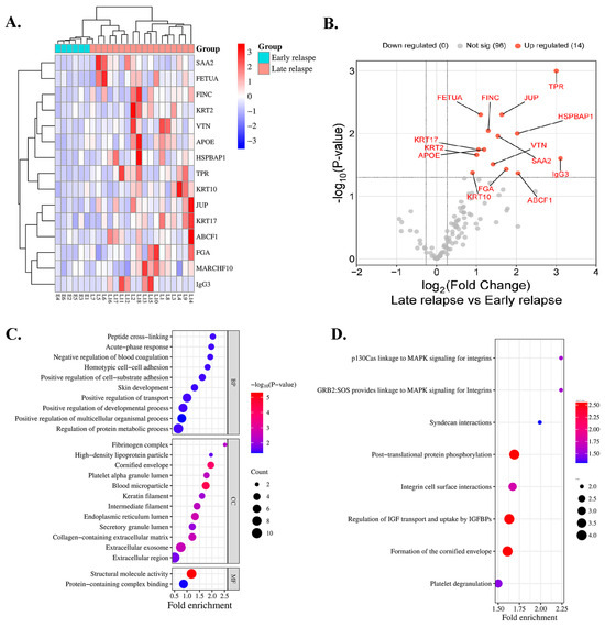 Protein expression profile of patients treated with EGFR-TKIs categorized by early and late relapse using proteomic analysis. (A) Heatmap of serum proteins exhibiting differential expression. Red indicates high expression, whereas blue indicates low expression. (B) Serum proteins that exhibit significant differential abundance are illustrated in the volcano plot. (C) GO classification and (D) reactome pathway enrichment analysis of differentially expressed serum proteins.