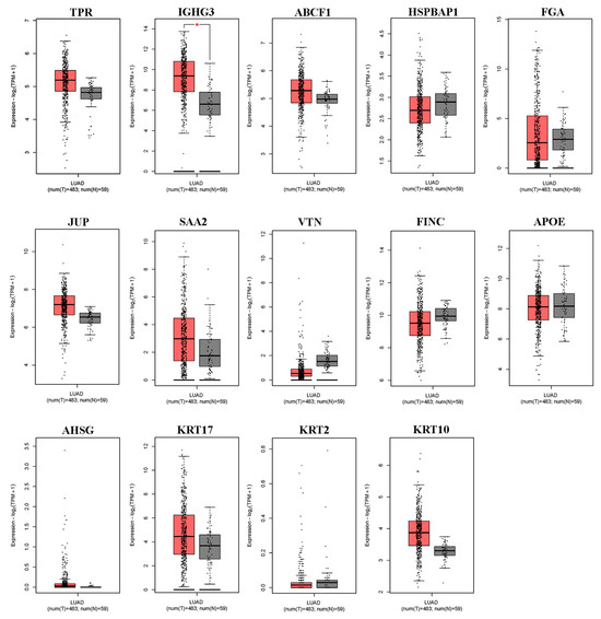 The expression levels of the 14 differentially expressed proteins in NSCLC tissues derived from the GEPIA2 database. Box plots illustrate the expression levels of TPR, IGHG3, ABCF1, HSPBAP1, FGA, JUP, SAA2, VTN, FINC, APOE, AHSG, KRT17, KRT2, and KRT10 in 483 lung adenocarcinoma (LUAD) tissues (T), represented in red, relative to the corresponding 53 normal lung tissues (N), represented in gray. * significant differences identified using the ANOVA test (p < 0.05).