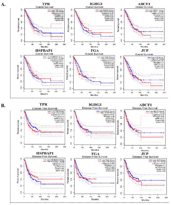 The prognostic significance of six DEPs in lung ADC tissues. Kaplan–Meier survival curves for overall survival (OS) (A) and disease-free survival (DFS) (B) of TPR, IGHG3, ABCF1, HSPBAP1, FGA, and JUP in patients with lung ADC.