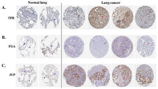 The analytical findings from the HPA database indicate the expression levels of TPR (A), FGA (B), and JUP (C) proteins in lung ADC and normal lung tissues. Alveolar cells are denoted by black arrows, macrophage cells by blue arrows, and tumor cells by red arrows.