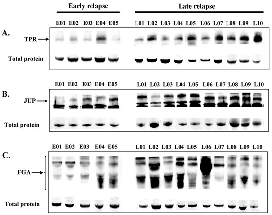 Serum expression levels (Western blotting) of TPR (A), JUP (B), and FGA (C) proteins in patients with early relapse compared with those with late relapse. The residual proteins on SDS-PAGE were used as an internal control.