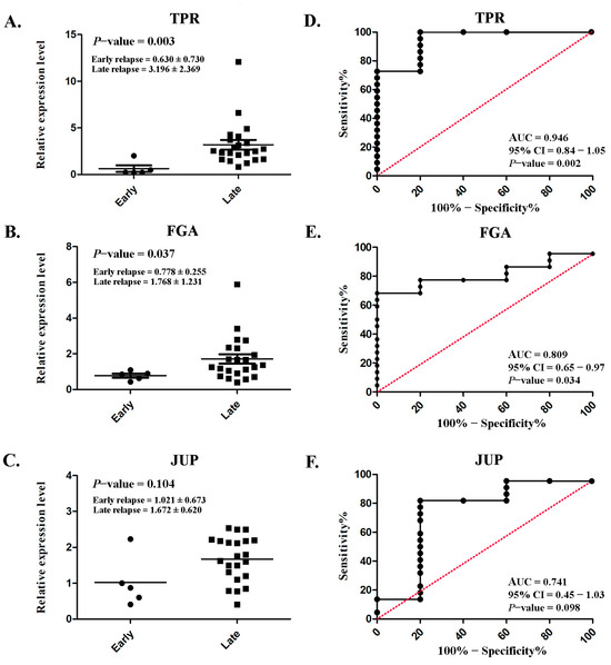 Serum TPR and FGA expressions were markedly increased in patients with late relapse (3.196 ± 2.369 and 1.768 ± 1.231, respectively) compared with those with early relapse (0.630 ± 0.730 and 0.778 ± 0.255, respectively), with p = 0.003 and p = 0.037 (Figure 6A,B), respectively. However, no significant difference was observed in JUP (p = 0.104; Figure 6C). ROC analysis was conducted to assess diagnostic predictability. Satisfactory AUCs of 0.946 (95% CI: 0.84–1.05; p = 0.002; Figure 6D) and 0.809 (95% CI: 0.65–0.97; p = 0.034; Figure 6E) were achieved for TPR and FGA, respectively. Although a significant difference was not achieved, the AUC for JUP was fair (0.741; 95% CI: 0.45–1.03; p = 0.034; Figure 6F).
