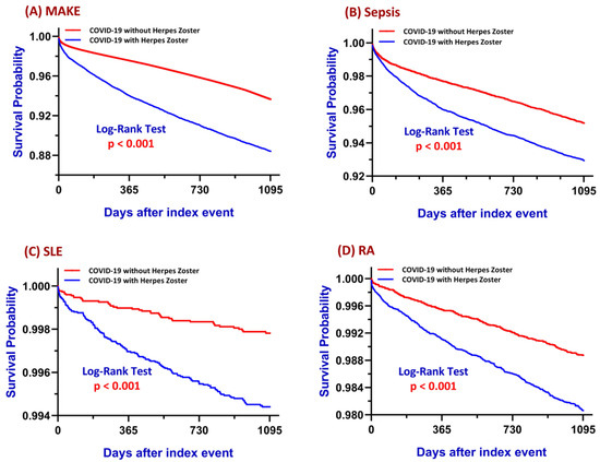 Kaplan–Meier survival curves comparing COVID-19 patients with and without herpes zoster (HZ) infection for (A) major adverse kidney events (MAKE), (B) sepsis, (C) systemic lupus erythematosus (SLE), and (D) rheumatoid arthritis (RA) over a three-year follow-up period. The blue line represents patients with HZ, and the red line represents those without HZ. The log-rank test was used to compare survival distributions between groups, with p-values provided in each panel. Abbreviations: COVID-19, coronavirus disease 2019; HZ, herpes zoster.