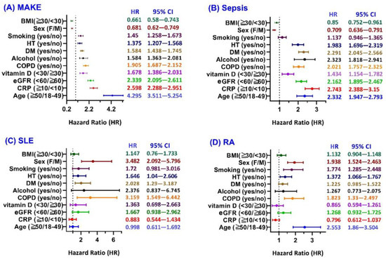 Subgroup analyses of risk factors associated with post-COVID herpes zoster–related outcomes. Hazard ratios (HRs) and 95% confidence intervals (CIs) for key covariates associated with four outcomes: (A) major adverse kidney events (MAKE), (B) sepsis, (C) systemic lupus erythematosus (SLE), and (D) rheumatoid arthritis (RA). Abbreviations: BMI, body mass index; COPD, chronic obstructive pulmonary disease; CRP, C-reactive protein; DM, diabetes mellitus; eGFR, estimated glomerular filtration rate; HT, hypertension.