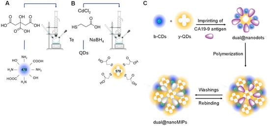 Synthesis of b-CDs (A) and of y-QDs (B). Assembly of the dual@nanoMIPs (C).