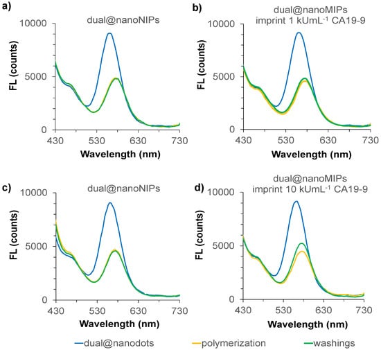 Fluorescence emissions obtained during assembly of the dual@nanoMIPs upon imprinting 1 kU/mL of CA19-9 (b) and 10 kU/mL of CA19-9 (d). The corresponding dual@nanoNIPs (a,c) in PBS.