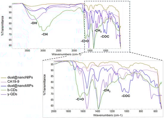 FTIR spectra of the dual@nanoNIPs (brown), CA19-9 (pink), dual@nanoMIPs (blue), b-CDs (green), and y-QDs (purple).