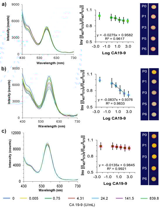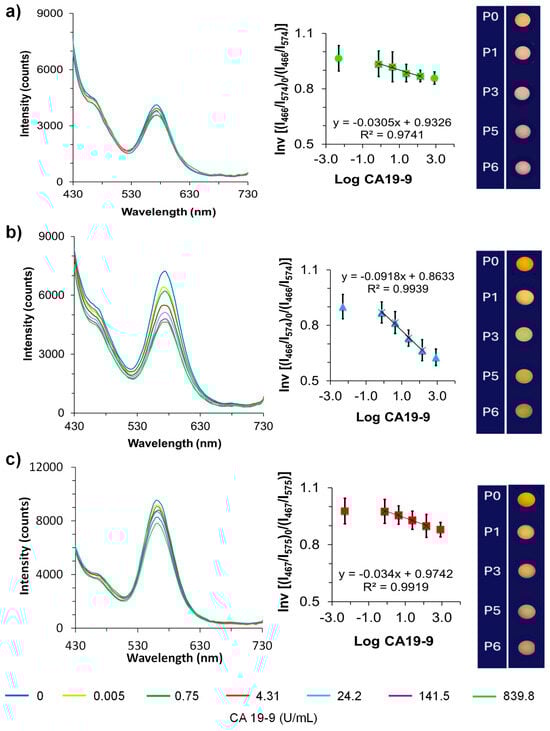 Fluorescence emissions and the corresponding gradient color panels observed under a 365 nm UV lamp and the corresponding emission spectra of the dual@nanoNIPs (a), dual@nanoMIPs (b), and dual@nanodots (c), during calibrations with CA19-9 standards in the interval range 4.98 × 10−3 U mL−1 to 8.39 × 102 U mL−1 in PBS. Insets are the correspondent Stern–Volmer plots.