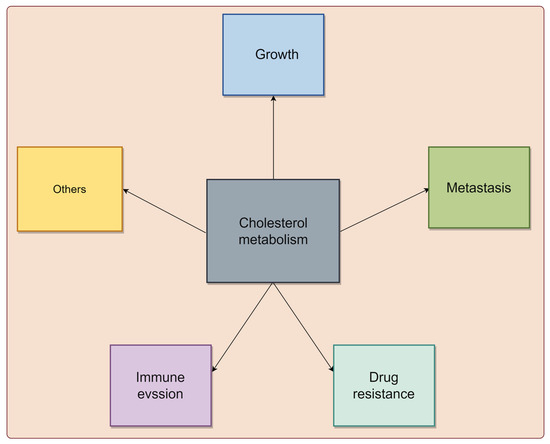 Cholesterol metabolism reprogramming is a pivotal adaptive mechanism in tumor cells, enabling them to meet the heightened energy and biosynthetic demands associated with unchecked growth [6]. Numerous epidemiological studies have unveiled a positive correlation between elevated cholesterol levels and an increased risk of various cancers, such as breast, prostate, and CRC [22,23,24]. Diets high in fat and cholesterol are also considered potential risk factors for certain malignancies [25,26]. Importantly, cholesterol metabolism plays a crucial role in tumor progression, influencing various aspects of cancer biology, including tumor growth, metastasis, drug resistance, and immune evasion (Figure 1).