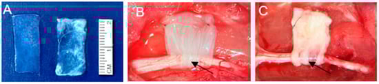 Application of hAM and the created hEP at the sciatic nerve crush site. (A) Dimensional assessment of the patches, each measuring 1 cm × 2 cm in length: (left) hAM and (right) hEP. (B) Sciatic nerve crush injury wrapped with hAM. (C) Sciatic nerve crush injury wrapped with hEP. Black arrows indicate the location of the injury at the crush site.