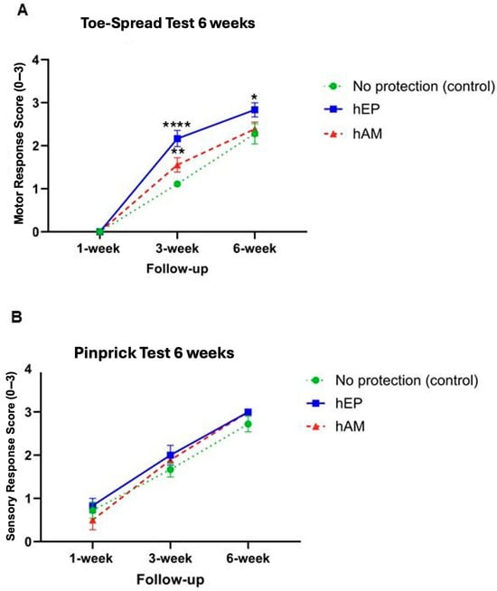 Functional sensory and motor assessment of nerve regeneration by Toe-Spread and Pinprick tests in the 6-week study at 1, 3, and 6 weeks following sciatic nerve crush injury. (A) Significantly better motor outcomes were observed when comparing the group that underwent hEP application with the no-protection group and the hAM wrapping group at the 3-week study point following nerve repair. Furthermore, statistically significant differences were evident between the no protective wrapping and hEP groups at the 6-week study endpoint. (B) This 6-week study did not yield statistically significant data from the Pinprick test. Both tests were scored using a 3-point scale (0–3), where higher values indicate better functional recovery: for the Pinprick test, 0 = no response, 1 = withdrawal response, 2 = withdrawal with some nocifensive behavior, and 3 = brisk and immediate nocifensive reaction; for the Toe-Spread test, 0 = no movement, 1 = weak or partial toe spreading, 2 = moderate spreading, and 3 = full, strong toe spreading. The graphs represent mean values with SEM; statistical significance is marked with asterisks: * p < 0.05, ** p < 0.01, **** p < 0.0001.