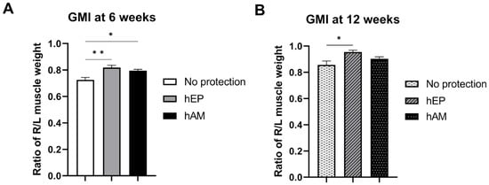 The assessments of muscle denervation atrophy by gastrocnemius muscle index (GMI) at 6 and 12 weeks following sciatic nerve crush injury. Significantly lower outcomes in the GMI were observed in the no protective wrapping group at both (A) the 6-week and (B) 12-week follow-up evaluations when compared to the hEP group. Data presented as mean ± SEM. A two-way ANOVA test for group comparison defined statistical significance, * p < 0.05, ** p < 0.01.