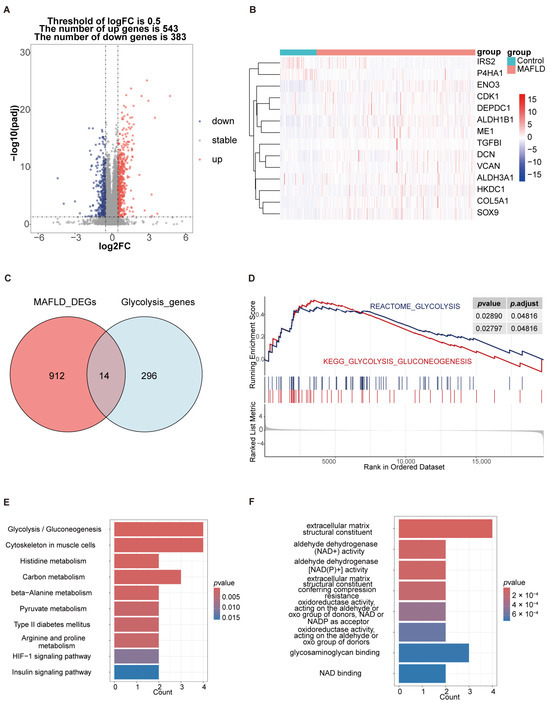 Identification and functional analysis of glycolysis-related differentially expressed genes (DEGs). (A) Volcano plot displaying DEGs in liver tissues from MASH patients compared to healthy controls. (B) Heatmap showing the expression profiles of glycolysis-related DEGs in healthy controls and MAFLD patients. (C) Venn diagram illustrating the intersection of DEGs and glycolysis-related genes. (D) GSEA of the glycolysis pathway. (E) KEGG pathway enrichment analysis of glycolysis-related DEGs. (F) GO pathway enrichment analysis of glycolysis-related DEGs.