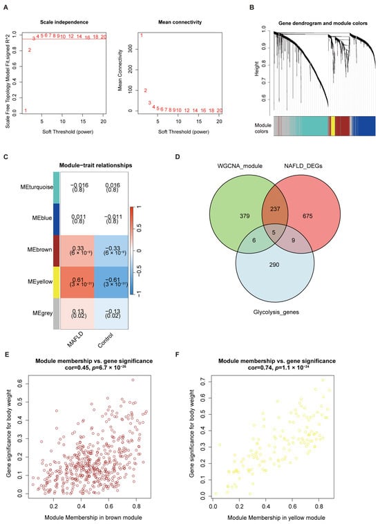 Identification of key modules associated with MAFLD and glycolysis-related key genes. (A) Determination of the soft-thresholding power in WGCNA. (B) Cluster dendrogram of the WGCNA analysis. (C) Module–trait relationship heatmap. (D) Venn diagram showing the overlap between key modules and glycolysis-related DEGs. (E,F) Scatter plots showing the correlation between GS with MM in the brown and yellow modules, respectively.