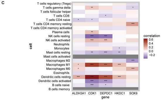 To investigate the immune response mechanisms in MAFLD, we applied the CIBERSORT algorithm to assess changes in immune cell abundance between MAFLD patients and healthy individuals (Figure 4A). Our results indicate that, compared to controls, the presence of macrophages M0, macrophages M1, T cells CD4 memory resting, and dendritic cells resting significantly increased in NAFLD samples. Conversely, the levels of macrophages M2 were significantly reduced in NAFLD samples compared to the control group (Figure 4B). Additionally, we used a correlation heatmap to illustrate the association between the key genes and various immune cells. ALDH3A1, CDK1, DEPDC1, and HKDC1 were positively correlated with the levels of macrophages M1, while SOX9 was negatively correlated with the levels of macrophages M2 (Figure 4C).