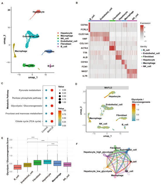 The glycolytic metabolic pathway in the characteristics of single-cell transcriptomics. (A) UMAP plot illustrating cell type distribution based on canonical marker genes. (B) Heatmap displaying the top two marker genes for each identified cell cluster. (C) Dot plot demonstrating significant differences in glycolysis-related metabolic pathway activity between control and MAFLD groups. (D) UMAP plot showing glycolysis/gluconeogenesis pathway activity across various cell types in MAFLD samples. (E) Box plot depicting glycolysis/gluconeogenesis activity levels among different cell types. (F) Circle plot indicating the number of intercellular interactions between immune cells and hepatocytes in high-glycolysis versus low-glycolysis groups. ****, p < 0.0001.