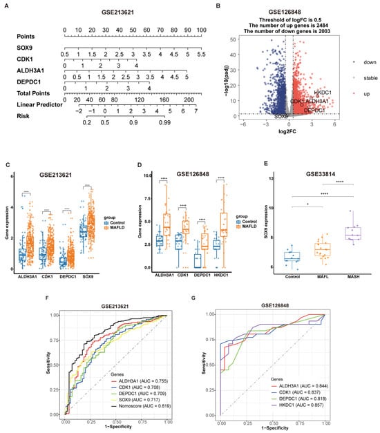 In order to determine the accuracy of optimal feature genes in diagnosing MAFLD, we constructed a nomogram using the GSE213621 dataset and analyzed their expression levels and diagnostic performance. The expression levels and diagnostic performance of the four key genes were validated in the external dataset GSE126848. First, a nomoscore chart was constructed based on optimal feature genes where the relative expression of each gene corresponded to a score (Figure 8A). The total score, calculated by summing the scores of each gene, represented the risk score for MAFLD. Figure 8B shows the volcano plot of differential gene analysis in the external dataset GSE126848, where the expression of the four key genes was significantly upregulated, except for SOX9, which showed no difference in expression. To further validate this finding, we analyzed the GSE33814 dataset and observed that SOX9 expression was significantly elevated in MAFLD patients, especially in those with MASH (Figure 8E). Figure 8C and Figure 8D display the expression levels of optimal feature genes in GSE213621 and the key genes in GSE126848, respectively, both of which were significantly elevated in the MAFLD group (p-value < 0.0001). The ROC curves in Figure 8F and Figure 8G demonstrate the good predictive performance of the key genes in GSE213621 and GSE126848, respectively, for identifying MAFLD patients.