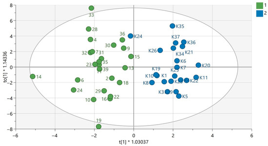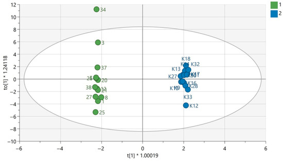 QC samples were grouped in the obtained PCA models for each analytical technique used, which confirms the repeatability of the plasma sample preparation procedure as well as the analytical measurements. This indicates that the observed metabolic differences in the compared groups according to gender were mainly the result of biological differences rather than analytical variability. The results of PCA modelling have been previously published [12,13]. The exemplary OPLS-DA models for GC-MS are presented in Figure 1 and Figure 2. The OPLS-DA models for the LC-MS technique in both ionization modes are displayed in Supplementary Materials.