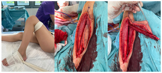 It is of paramount importance, as in the case of inadequate blood supply to the transferred bone, the osseointegration of the flap with the adjacent bone stumps is considerably impaired and, in many cases, even impossible to achieve. Moreover, harvesting the skin island as a component of the FFF, apart from making tissue dissection more technically demanding and the need to identify skin perforators, does not carry any additional burden for the patient. Simultaneously, it allows for continuous monitoring of the buried bone in a safe and objective way without the need for imaging tests such as CT angiographs, which expose patients to radiation and nephrotoxicity related to the injected contrast [27,28,29]. In all cases, the donor sites were closed tension-free primarily, without the need for skin grafting (Figure 6). The skin island covering the vascularized bone graft additionally reduced the skin tension within the treated limb, which could have contributed to such a rare wound healing disorder in the analyzed group of patients (5%). Considering the above, it is difficult to find a reasonable explanation for not routinely taking into account the skin island as an external “monitor” during FFF harvest (Figure 8).
