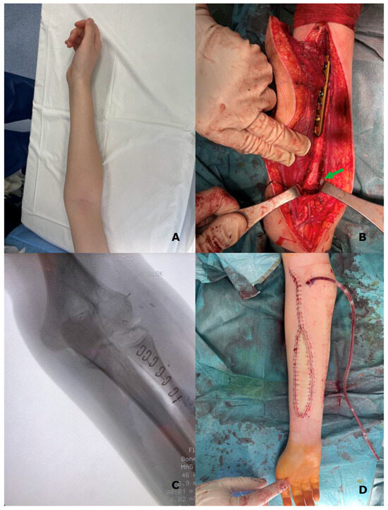 (A)—preoperative X-ray of the left upper limb with diagnosed Ewing Sarcoma of the radius; (B)—fibula free flap harvested with the fibular head (green arrow) placed within the wound bed after resection of the radial bone; (C)—intraoperative X-ray presenting the proper position of the fibular head within the annular ligament; and (D)—postoperative X-ray of the upper limb with a visible skin island of the fibula free flap (as a monitor of the appropriate perfusion of the buried part of the flap).