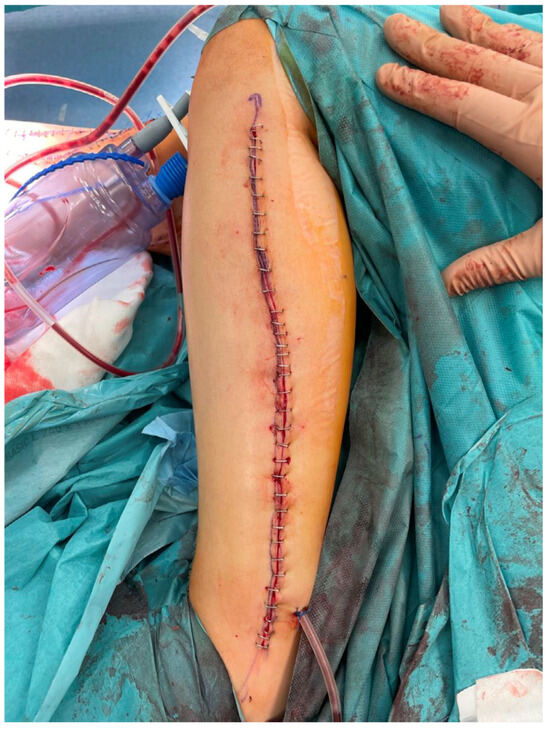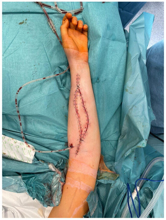 An intraoperative photograph of a skin island’s inset within the treated upper limb—a healthy skin paddle without signs of vascular congestion. Attention is drawn to the tension-free closure of the skin layers within the forearm.