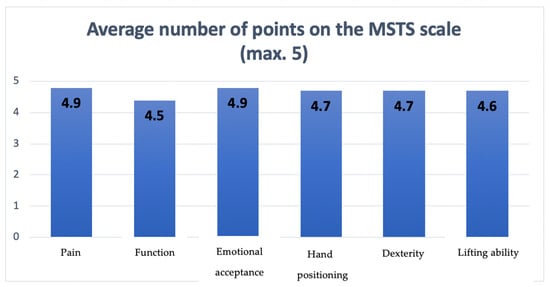 Using the functional MSTS scale, the surgical team assessed the study participants. With a range of 19–30 points, the average MSTS score was 26.8 points. Figure 7 shows the average number of points for each evaluated characteristic on the MSTS scale.