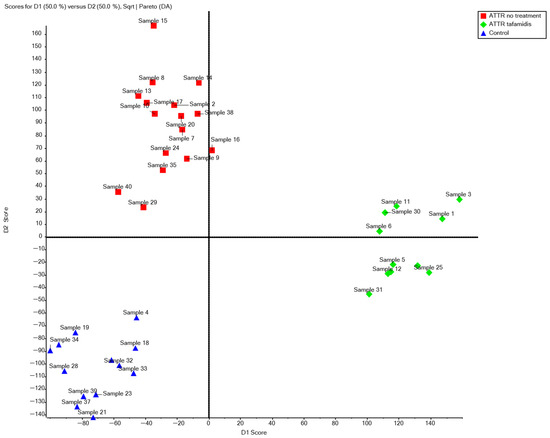 Many proteins did not show statistically significant differences between groups. However, this should not be directly interpreted as evidence of their biological stability. These results may reflect individual variability or methodological factors. Without repeated measurements or biological replicates, subtle or subject-specific variations may go undetected. Analysis of the area under the chromatographic peak of the peptide data for peptides assigned to identified proteins (Figure 1) revealed significant differences in the distribution of results between samples. Figure 1 shows that samples from ATTR-CA patients treated with tafamidis had higher D1 values than those from untreated ATTR-CA patients. This suggests that treatment positively impacts peptide signal intensity. Additionally, outlier points highlight samples with unusually high results that merit further investigation.