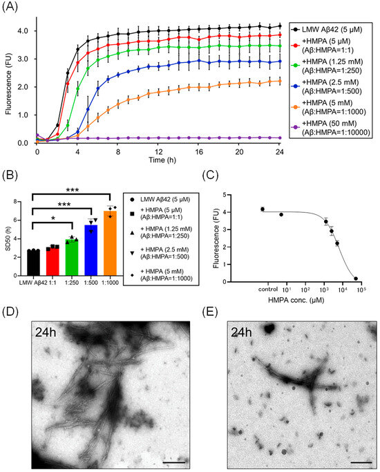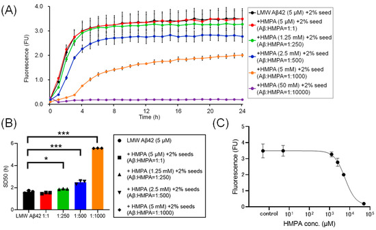 To assess the statistical significance of SD50 among six different samples, LMW Aβ42 without HMPA was compared to samples containing different concentrations of HMPA (5 µM, 1.25 mM, 2.5 mM, 5 mM, and 50 mM) using Dunnett’s test, that was performed using a GraphPad Prism software (version 8.0.2, GraphPad Software, Boston, MA, USA).