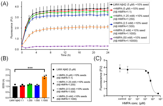 To assess the kinetics under another sample condition containing 10% MF seeds, we analyzed the ThT kinetics of LMW Aβ42 and 10% MF seeds with or without HMPA. The mixed sample containing LMW Aβ42 with 10% MF seeds and 50 mM HMPA demonstrated no increase in ThT fluorescence, whereas the other mixed samples demonstrated sigmoidal curves (Figure 4A). The sigmoidal curves among LMW Aβ42 and10% MF seeds with or without HMPA (5 µM and 1.25 mM) demonstrated similar kinetic curves (Figure 4A). In contrast, the plateau values of ThT fluorescence in LMW Aβ42 and 10% MF seeds when HMPA (2.5 and 5 mM) was included were reduced compared to those of LMW Aβ42 and 10% MF seeds without HMPA (Figure 4A). The SD50 values of LMW Aβ42 with 10% MF seeds without HMPA were significantly lower than those of LMW Aβ42 with 10% MF seeds and HMPA (5 mM) (p < 0.0001) (Figure 4B). Additionally, we were unable to analyze the SD50 in LMW Aβ42 with 10% MF seeds and HMPA (50 mM) because the sigmoidal curve fittings had failed. Thus, based on the EC50 results, the HMPA concentration at 50% of the peak value of the sigmoidal curve in the kinetic assays was 5328 µM (Figure 4C).
