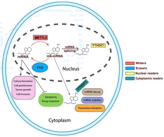 Modification at N6 position of adenosine in mRNA (m6-mRNA) by FTO. Writer proteins such as METTL3 add a methyl group at the N6 position of mRNA, which is recognized by several reader proteins like YTHDC1. This leads to various post-transcriptional effects like mRNA decay, mRNA stability, and translation. However, eraser proteins, such as FTO, remove the N6 methyl group, promoting colony formation, cell proliferation, and tumorigenesis in various cancers. Studies also suggest that removal of this methyl group lowers drug response and apoptosis in cancer.