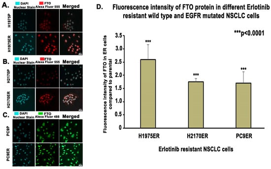 FTO was upregulated at gene and protein levels in multiple EGFR-TKI-resistant NSCLC cell lines. These cell lines were made resistant to EGFR TKIs by continuously exposing them to IC50 and higher concentrations of EGFR TKIs (Supplementary Table S1) [,,,]. Immunofluorescence studies demonstrated a 1.8-fold, 1.7-fold, and 2.6-fold increase in FTO expression in erlotinib-resistant (ER) H2170, PC9, and H1975 cells compared to their parental cell lines, respectively (Figure 2). FTO was found localized in the nucleus of both ER and parental cells (Figure 2A–C). RNA levels were significantly elevated in both erlotinib- and osimertinib-resistant cells (Figure 3). Furthermore, all three ER cell lines demonstrated an increase in FTO protein expression relative to their parental cell lines even in the presence of both EGF and erlotinib (Figure 4A). FTO protein was 1.8-fold, 2.1-fold, and 1.6-fold higher in H1975 ER, H2170 ER, and PC9 ER cells, respectively, compared to their parental cells (Figure 4B).