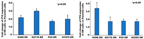 We performed qPCR and immunoblotting experiments to check for expression of FTO in NSCLC cell lines. At the gene level, FTO was upregulated in H2170 OR, PC9 OR, H2170 ER, PC9 ER, and H1975 ER cells compared to their parental cells (Figure 3). Similarly, Western blot demonstrated that FTO protein was upregulated in H1975 ER, PC9 ER, and H2170 ER cells (Figure 4). These findings were consistent with previous studies showing FTO enrichment in serum samples and tumor tissues of gefitinib-resistant NSCLC patients []. Hence, high expression of FTO at the gene and protein level in EGFR-TKI-resistant cell lines strongly suggests that FTO plays a role in the development of EGFR TKI resistance in non-small cell lung cancer cells.