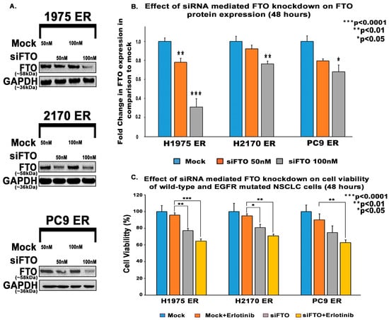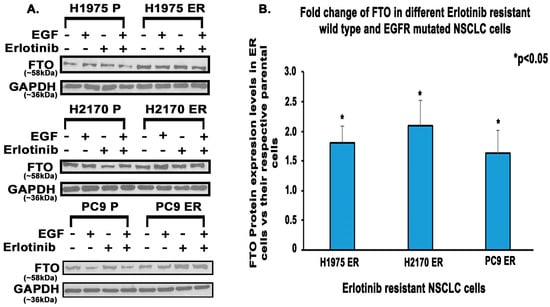 FTO Protein Modulation in the Erlotinib-Resistant Wild-Type and EGFR-Mutated NSCLC Cell Lines. (A) First, 3.5 × 105 cells were seeded in a 35 mm dish and allowed to grow for 24–48 h until reaching 90% confluency, after which the cells were treated with serum free media (Plain media with 0.5% BSA) for 24 h, and then the cells were either treated with EGF (15 ng/mL for 2.5 min) and/or 10 µM erlotinib (1975 ER and 2170 ER) and 13 nM (PC9 ER) for 24 h. (B) The immunoblotting results showed that the FTO protein was 1.8-fold, 2.1-fold, and 1.6-fold higher in H1975 ER, H2170 ER, and PC9 ER cell lines respectively. The fold change in parental cells was considered 1-fold. The modulations in the protein expression were calculated by densitometric analysis using the ImageJ software (version 1.46, National Institutes of Health, Bethesda, MD, USA), and the results were statistically significant by the two-tailed t-test analysis.