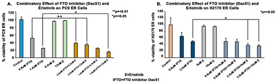 Effect of FTO Inhibition on the Efficacy of Erlotinib in EGFR-TKI-Resistant PC9 and H2170 ER cells. First, 6000 ER cells per well were plated in a 96-well plate. Once the required confluency was achieved, the lanes were treated with varying concentrations of Dac51 and erlotinib to study the efficacy of the combination. (A,B) We found the Dac51 and erlotinib had a more than additive effect in PC9 ER (0.8 µM Dac51 with 13 nM erlotinib) and H2170 ER (2.5 µM Dac51 with 10 µM erlotinib). The drug and inhibitor combination displayed a 13.4% and 7.7% increase in inhibition compared to the drug and inhibitor individually in PC9 ER and H2170 ER cells, respectively. Thus, the effectiveness of the drug seems to be enhanced by the FTO inhibitor, hence, suggesting FTO’s potential to combat EGFR TKI-Resistance. These results were found to be significant using the one-way ANOVA with Dunnett’s post hoc test.