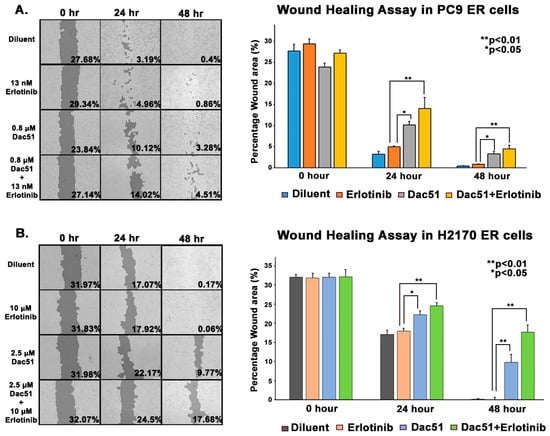 First, 250,000 cells/well were seeded in a 24-well plate and were allowed to grow until 100% confluency in RPMI media. A 200 µL tip was used to create a scratch in the field. The cells were then treated with erlotinib and/or Dac51 for 48 h at 37 °C. Images were taken at 40× magnification at 0-h, 24-h, and 48-h time points and analyzed using T-scratch software (version 1.0, ETH Zurich, Zurich, Switzerland). Data are represented as the average of two independent experiments.