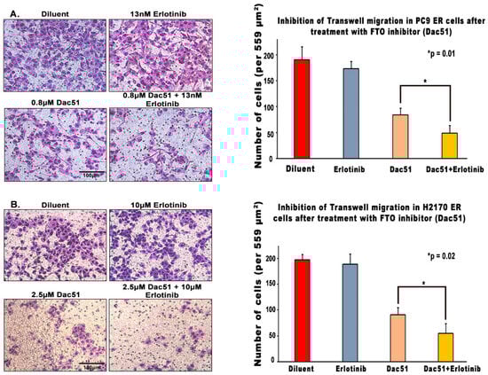 We then explored whether decreasing FTO levels alters the migratory capacity of lung tumor cells using wound healing assays and transwell assays. Combination treatment slowed down the cell migration more than the FTO inhibitor alone or erlotinib alone in erlotinib-resistant cell lines. After creating a scratch occupying about 27% of the field in PC9 ER cells, Dac51 and combination treatment slowed down wound closure by 11.2% and 14.1%, accordingly (Figure 7A). Similarly, forty-eight hours after creating a scratch occupying about 32% of the field, the wounds of the control and erlotinib-treated wells had closed, whereas Dac51 treatment slowed down wound closure by 30.4% and the combination treatment by 55.1% in H2170 ER cells (Figure 7B). Furthermore, transwell assays demonstrated that combination treatment drastically decreased the number of migrated H2170 ER and PC9 ER cells in both cell lines. Dac51 decreased the number of migrated cells by about 55% compared to diluent, and erlotinib alone reduced that by 4–8%. Combination treatment, on the other hand, lowered the number of migrated cells by 71% (Figure 8A,B). The reduction in both wound healing capacity and number of migrated cells was more than the cumulative effect of erlotinib and FTO inhibitor alone, which indicated that FTO might enhance ER cells’ abilities to migrate and expand.