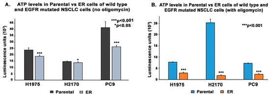 We then explored whether FTO levels alter the ATP levels of lung tumor cells using an ATP assay. We found that FTO levels were inversely proportional to the levels of ATP. The cells were cultured in 96-well plates and were provided with glucose free media with or without oligomycin (a specific inhibitor of oxidative phosphorylation) for 30 min before quantifying ATP levels. We found that ATP was downregulated by 1.3-fold in H1975 ER, 1.1-fold in H2170 ER, and 1.6-fold in PC9 ER with no oligomycin treatment (Figure 9A) and 2.7-fold in H1975 ER, 14.4-fold in H2170 ER, and 3.1-fold in PC9 ER cells when treated with oligomycin (Figure 9B) compared to the respective parental cells. The fold change was calculated using luminescence readout in ER cells against their respective parental cells, and the results were found to be statistically significant by two tailed t-test analysis.