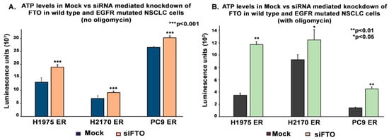 To further confirm the role of FTO in the ATP modulation, we downregulated FTO expression using siRNA. For this study, we performed an ATP assay on H1975 ER, H2170 ER, and PC9 ER, after they were transfected with mock siRNA and FTO-specific siRNA. The cells were cultured in 96-well plates and were provided with glucose free media with or without oligomycin for 30 min before quantifying ATP levels. The trend we found earlier was consistent here, as the knockdown of FTO caused ATP levels to increase in the presence and absence of oligomycin. We found that ATP was upregulated by 1.4-fold in H1975 ER, 1.3-fold in H2170 ER, and 1.2-fold in PC9 ER with no oligomycin treatment (Figure 10A) and 3.4-fold in H1975 ER, 1.3-fold in H2170 ER, and 3.2-fold in PC9 ER cells when treated with oligomycin (Figure 10B) compared to their respective mock siRNA transfected cells. The fold change was calculated using the luminescence readout in ER cells against their respective parental cells, and the results were found to be statistically significant by two tailed t-test analysis.