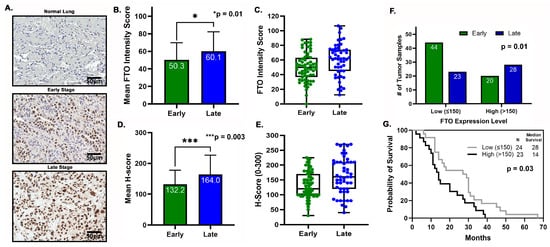To study whether FTO participates in tumor progression of non-small cell lung cancers and exhibits prognostic potential, we studied FTO expression in lung tissues of patients diagnosed at different tumor stages (Supplementary Table S2). Of the 115 tumor sections, 85% were adenocarcinomas. Sixty-four were early-stage NSCLC tumors (I-IIIA), and 51 (IIIB-IV) were at advanced, late stages. Both early- and late-stage NSCLC samples expressed FTO predominantly localized to the nuclei (Figure 11A). Late-stage lung cancer tissues had statistically significantly (p = 0.01) higher FTO expression compared to early-stage tissues by both imaging study and pathology grading (Figure 11B,D). We also created a dot plot to quantify the FTO intensity and H-scores from patients with late-stage tumors compared to early-stage tumors (Figure 11C,E). When dividing patients into low and high expression levels, we found that 68.7% of early-stage tissue samples exhibited low expression level, and 55% of late-stage tumor tissues had high FTO expression (Figure 11F). Additionally, high expression of FTO was associated with late-stage lung cancer as seen by Fisher’s exact test (p = 0.01). With the available survival data, 47 cases including both early- and late-stage NSCLC were analyzed. Patients who have tumors with low FTO expression lived 14 months longer than those with high FTO level (Figure 11G). Hence, high FTO expression is associated with poorer survival (p = 0.03). These findings suggest that FTO could be a potential marker for poorer prognosis and warrant studies to explore the role of FTO in promoting tumor growth.