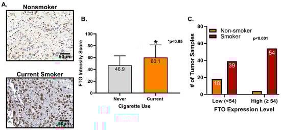 The relationship that exists between cigarette smoking and the development of lung cancer has been well studied for many years []. To further our understanding of FTO expression in NSCLC patients, we aimed to identify if a correlation exists between the use of cigarettes and FTO expression. A total of 50 NSCLC tumor sections were stained (Figure 12A) (28 smokers and 22 non-smokers, Supplementary Table S2). The results indicated that patients who smoked had a higher expression of FTO when compared to their non-smoking counterparts. Using a BZ-X810 Keyence microscope, the intensity of the FTO expression was quantified and determined to be 28% higher in smokers, compared to non-smokers (p < 0.05) (Figure 12B). A Fisher’s exact test was used to compare high and low expression of FTO with smoking status for smokers and non-smokers. The correlation between the intensity of FTO in smokers versus non-smokers was found to be statistically significant after dividing the patients into high and low expression groups (Figure 12C). We found smokers had a higher FTO expression when compared to their non-smoker counterparts: 58.1% of smokers’ tumor samples showed high FTO expression compared to 18.1% in non-smokers. The results indicated smokers were 3.2 times more likely to have a higher FTO expression when compared to those that were non-smokers (p = 0.001, using Fisher’s exact test). Since smokers are more likely to have a high expression of FTO, this suggests these patients might be more prone to drug resistance and tumor growth.