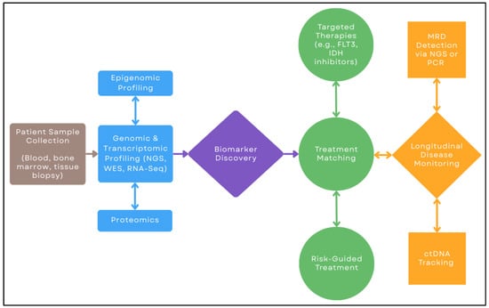 AML is a heterogeneous disease characterized by diverse molecular alterations that impact prognosis and treatment response. Precision medicine in AML focuses on identifying recurrent mutations such as FLT3, IDH1/2, NPM1, and TP53 to guide therapeutic decisions [50].