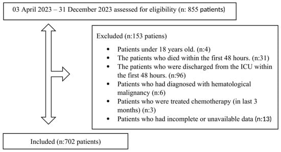 A total of 855 patients were assessed for eligibility between 3 April 2023 and 31 December 2023. Among these, 153 patients were excluded for the following reasons: age under 18 years (n:4), death within the first 48 h (n:31), discharge from the ICU within the first 48 h (n:96), diagnosis of hematological malignancies (n:6), chemotherapy treatment within the last 3 months (n:3), and incomplete or unavailable data (n:13). After exclusions, 702 patients were included in the final analytical cohort (Figure 1).