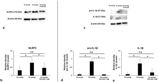 Quantitative Western Blot analysis demonstrated that pressure elevation significantly increased expression of NLRP3 (Figure 2a,b). Quantitative Western Blot analysis also demonstrated that pressure elevation significantly increased expression of IL-1β and pro IL-1β (Figure 2). Figure 2d,e show the relative density of IL-1β and pro IL-1β in retinas under each condition. Quantitative analysis showed that NLRP3 expression increased from 0.25 ± 0.06 at 10 mmHg to 1.06 ± 0.15 at 75 mmHg and was reduced to 0.39 ± 0.11 with TAK-242 treatment (Figure 2b). Similarly, pro IL-1β levels increased from 0.073 ± 0.072 at 10 mmHg to 0.86 ± 0.10 at 75 mmHg and decreased to 0.067 ± 0.046 with TAK-242 (Figure 2d). Mature IL-1β expression increased from 0.081 ± 0.097 at 10 mmHg to 0.73 ± 0.25 at 75 mmHg and was suppressed to 0.19 ± 0.22 with TAK-242 treatment (Figure 2e).