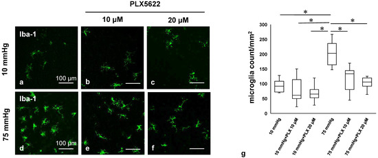 Pharmacological depletion of microglia using PLX5622. (a–c) PLX5622-dependent microglial distribution at 10 mmHg: (a) without PLX5622, (b) 10 μM PLX5622, (c) 20 μM PLX5622. (d–f) PLX5622-dependent microglial distribution at 75 mmHg: (d) without PLX5622, (e) 10 μM PLX5622, (f) 20 μM PLX5622. (g) The density of immune-positive microglia for Iba-1 antibody in whole mounted retinas under each condition (n = 7 in each experiment, Tukey’s multiple comparison test, * p < 0.05).