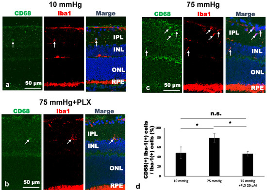 Cryosections double-stained with anti-CD68 antibody (green) and anti-Iba-1 antibody (red). Co-localization of CD68/Iba-1 is visualized in a merged image. (a) At 10 mmHg, there were a small number of CD68-positive/Iba-1-positive microglia. (b) At 75 mmHg, microglia proliferated, and the proportion of CD68-positive microglia increased. (c) An increase in CD68-positive microglia was attenuated by treatment with 20 μM PLX5622, restoring the proportion to levels comparable to those at 10 mmHg. (d) Quantification of the proportion of CD68-positive cells among Iba-1-positive microglia under each condition (n = 3 per group, Tukey’s multiple comparison test, * p < 0.05). “n.s.”: non-significant.