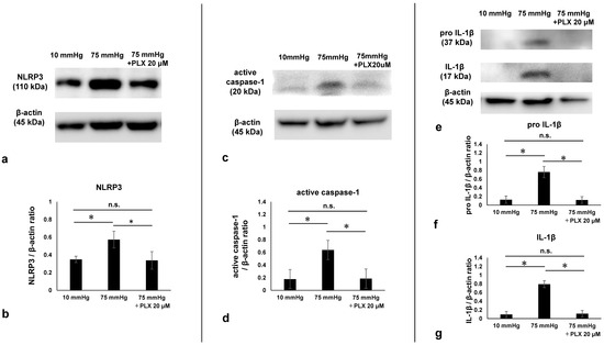 Western blotting of pressure-dependent changes in NLRP3, pro IL-1β, and IL-1β. (a). Representative immunoblotting for NLRP3 and actin. (b). Relative densitometry analysis of NLRP3 expression (n = 6 in each experiment, Tukey’s multiple comparison test, * p < 0.05). (c). Representative immunoblotting for pro IL-1β, IL-1β, and actin. (d). Relative densitometry analysis of pro IL-1β (n = 6 in each experiment, Tukey’s multiple comparison test, * p < 0.05). (e). Relative densitometry analysis of IL-1β expression (n = 6 in each experiment, Tukey’s multiple comparison test, * p < 0.05). The samples shown were derived from separate gels and experiments conducted on different days. All blots were processed using identical protocols. “n.s”: non-significant.
