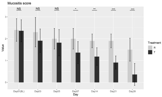 Mucositis severity score variation over time for Treatment T and Treatment R. NS = non-significant, * = p < 0.01, ** = p < 0.001, *** = p < 0.0001.