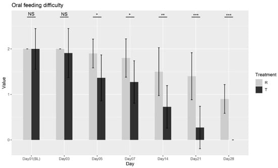 Oral feeding difficulty scores over time for Treatment T and Treatment R. NS = non-significant, * = p < 0.01, ** = p < 0.001, *** = p < 0.0001.