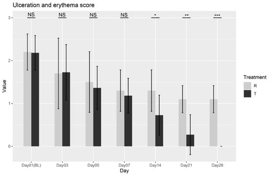 Ulceration and erythema scores variation over time for Treatment T and Treatment R. NS = non-significant, * = p < 0.01, ** = p < 0.001, *** = p < 0.0001.