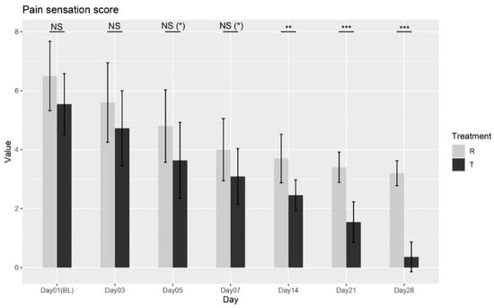 Pain sensation score variation over time for Treatment T and Treatment R. NS = non-significant, * = p < 0.01, ** = p < 0.001, *** = p < 0.0001.
